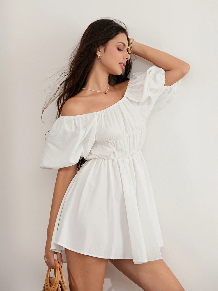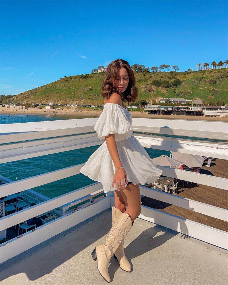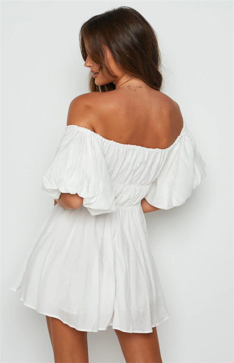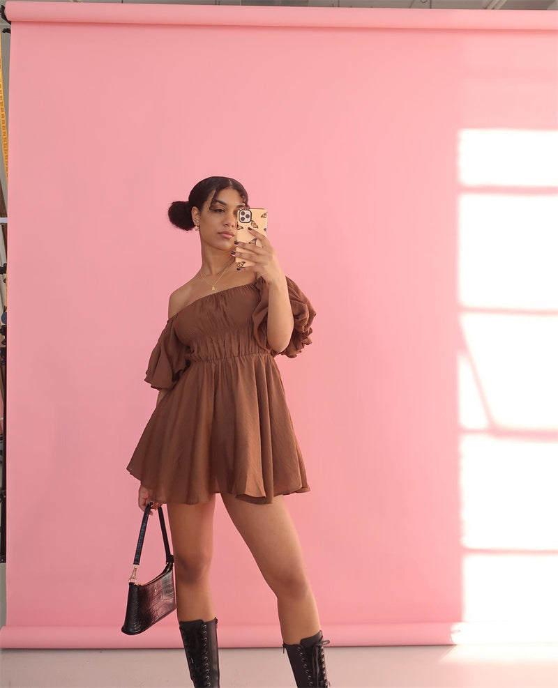 Women Casual Summer Dress Fashion Sexy Solid Color Elegant Short Puff Sleeve Off-shoulder Tunic Dress Brown/White