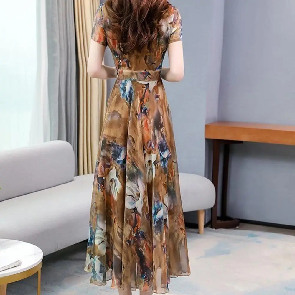 Women Party Dress Elegant Floral Print Maxi Dress A-line Big Swing Summer Dresses Retro Ice Silk Pleated Prom Evening Dress