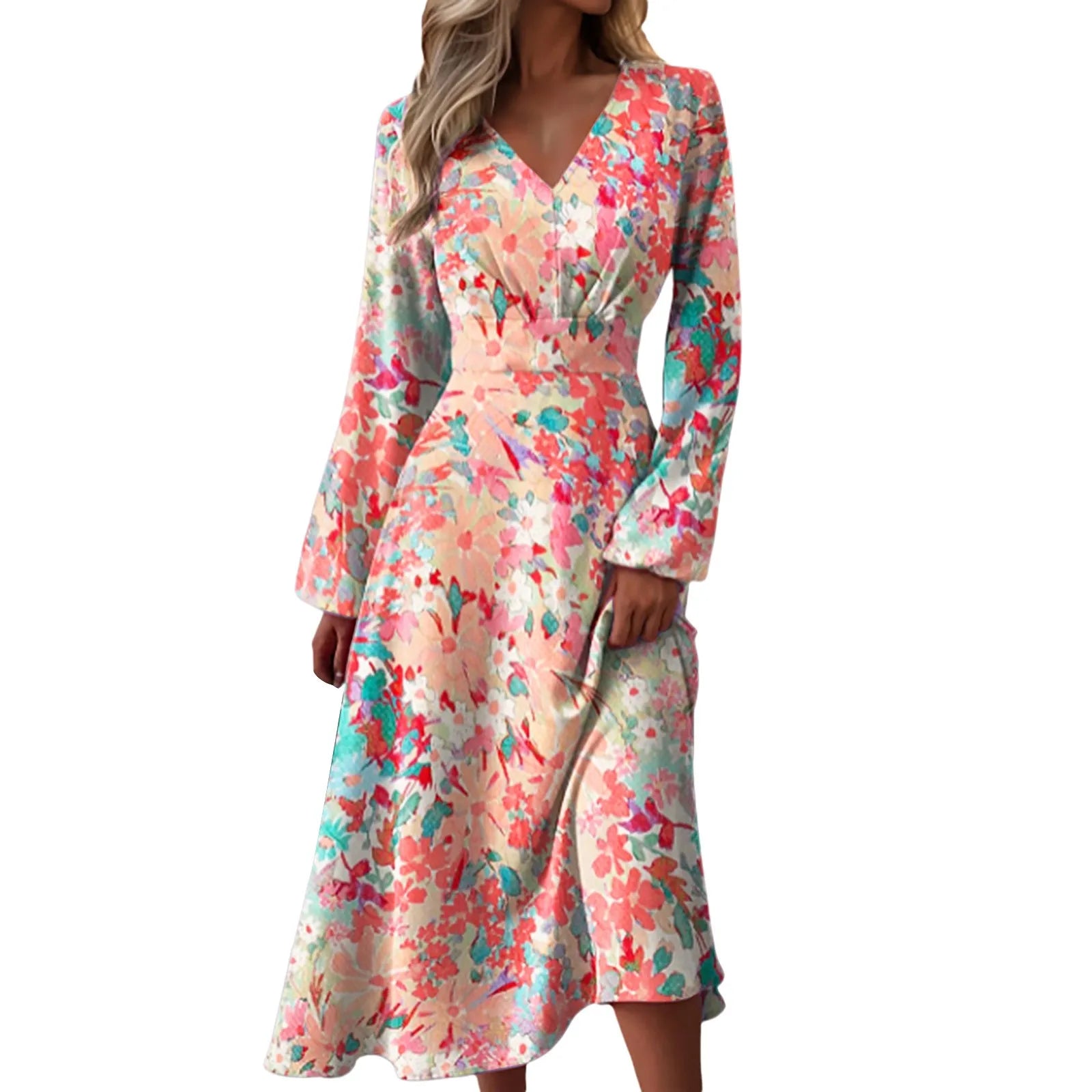 Women Print Dress Long Sleeve V Neck Casual Elegant Retro Fashion Slim Casual Ladies Spring Autumn Dresses Vestidos Clothing