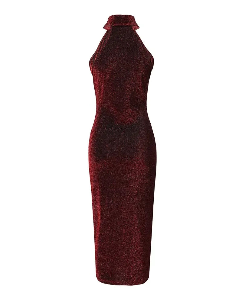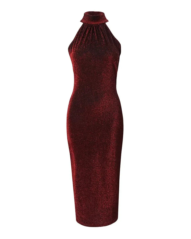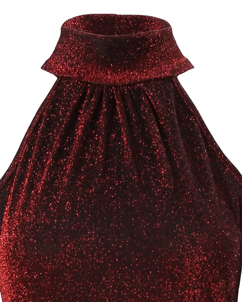 Women Sexy Slim Mini Dress Halter High Neck Sleeveless Glitter Bodycon Dress Evening Party