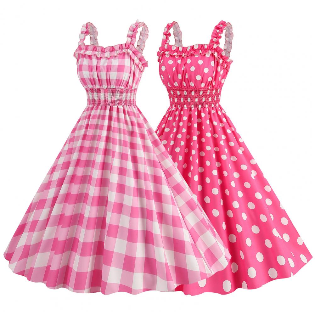 Women Vintage Barbiee Pink Plaid Dress Retro Rockabilly Strap Suspenders Cocktail Party 1950s 40s Swing Dress Summer Dresses